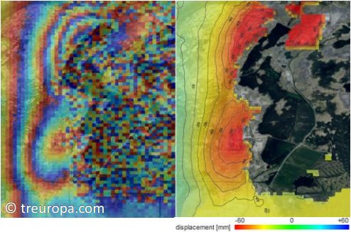 слева - дифференциальная интерферограмма, справа - карта смещений